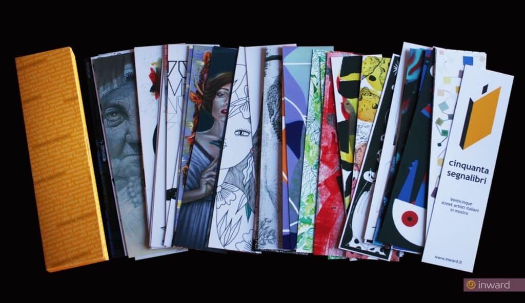 Era il 2005 quando INWARD produsse la sua prima esposizione, “Quarantotto Segnalibri”: in quell’occasione 24 graffiti writer italiani rielaborarono la propria estetica su due piccoli (decisamente molto più piccoli dei muri a cui erano abituati) supporti, stampati poi in centinaia di esemplari di segnalibri d’artista (di cui, grazie a KayOne, anche io possiedo una copia comprensiva di tutti loro). Nel 2017, poi, la storia si è ripetuta: le produzioni di 25 esponenti italiani di street art e nuovo muralismo sono infatti confluite in “Cinquanta Segnalibri”, un panorama multiforme che riflette differenti background e restituisce la ricchezza dei diversi stili tipici dell’ancora più attuale e ampia creatività urbana italiana.
