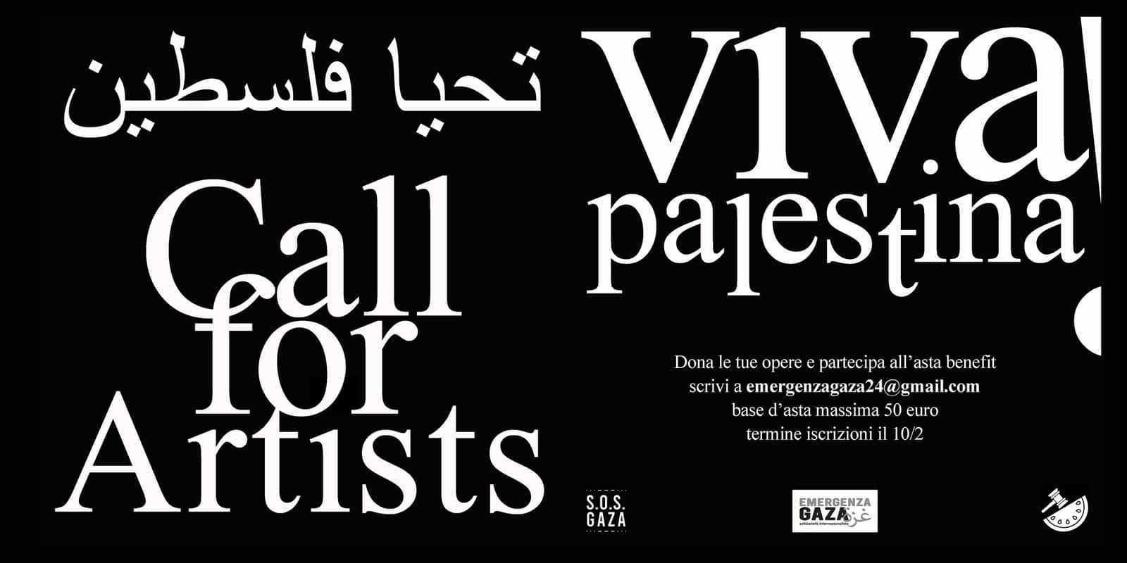 C’è tempo fino al 10 febbraio per rispondere alla Call for Artists “Arti per Gaza” lanciata dalla rete di supporto EMERGENZA GAZA. La chiamata, aperta a tutte le tipologie di arte visiva, è un invito a presentare e donare la propria opera per l’asta benefit in sostegno della popolazione della Striscia di Gaza, che si terrà il 15 febbraio 2025 al Leoncavallo di Milano.
