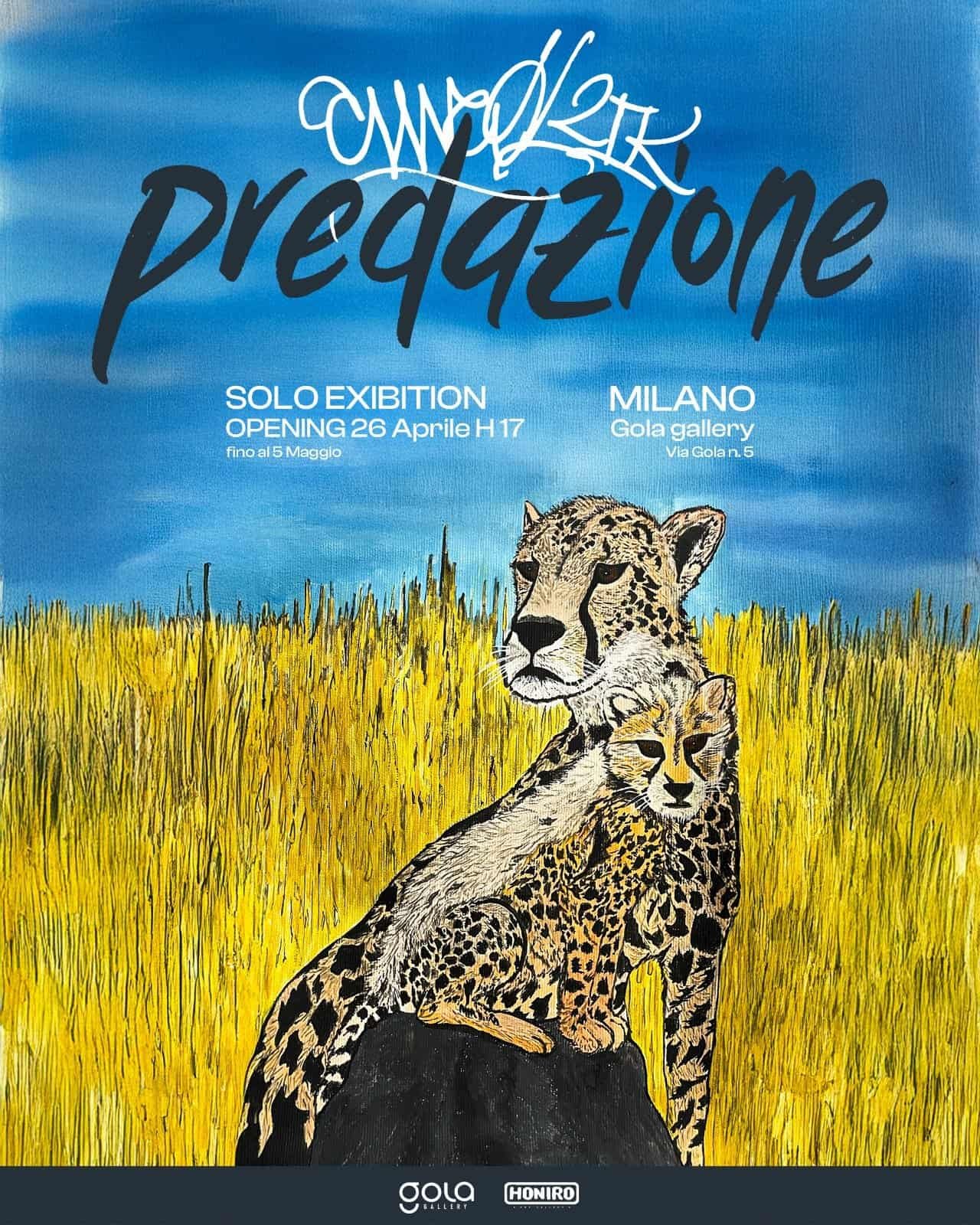 Oggi e fino al prossimo 5 maggio, alla Gola Gallery di Milano, Chicoria espone nella sua personale “Predazione”, una doppia lettura tra natura e strada In “Predazione” Chicoria mette in scena una riflessione viscerale, quasi brutale, su un istinto che accomuna la natura selvaggia e l’animo umano: la fame. Da una parte, le tele ci mostrano il volto crudo della predazione animale — istintiva, necessaria, regolata da leggi antiche quanto la vita stessa. Predatori e prede si affrontano in un ciclo eterno, senza giudizio, senza morale. Sono natural born killers, creature forgiate dalla selezione naturale, costrette a muoversi secondo una legge inevitabile: chi non caccia, muore. Dall’altra, i testi e i versi di Chicoria portano la stessa fame nel cuore delle strade. Qui, la predazione prende la forma della rivalsa sociale, del desiderio feroce di chi nasce senza niente e rifiuta di restare fermo, invisibile. La fame non è solo fisica: è desiderio di contare, di elevarsi, di conquistare un posto in un mondo che non fa sconti.