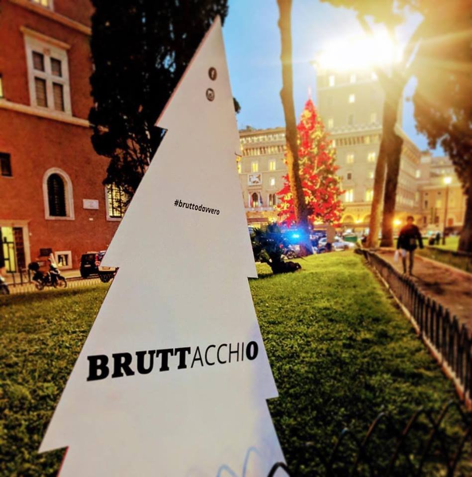 Nel secondo caso, invece, la critica è giunta dritta dritta al sindaco Virginia Raggi, che l’anno scorso non ci aveva preso nemmeno sulla scelta dell’albero di natale per la città Eterna: Spelacchio, così i social avevano rinominato il povero alberello che facevo bella (beh..) mostra di sé in piazza Venezia, era infatti diventato famoso per le sue fronde particolarmente spoglie. Quest’anno l’albero natalizio romano si è rifatto il trucco, e la pentastellata prima cittadina ha chiamato niente meno che Netflix per assicurarsi che ci fosse qualche ago in più rami del povero pino sacrificato. Ma nemmeno un investimento di 376mila euro per 60 mila luci a led a basso consumo energetico e 500 sfere di color argento e rosso ha fermato i ragazzo di BRUTTO che, al contrario, hanno voluto dire la loro mettendo in piazza Bruttacchio.
