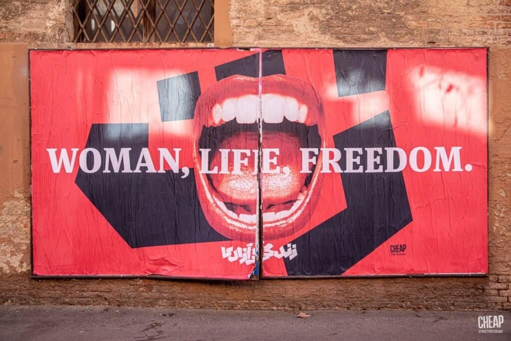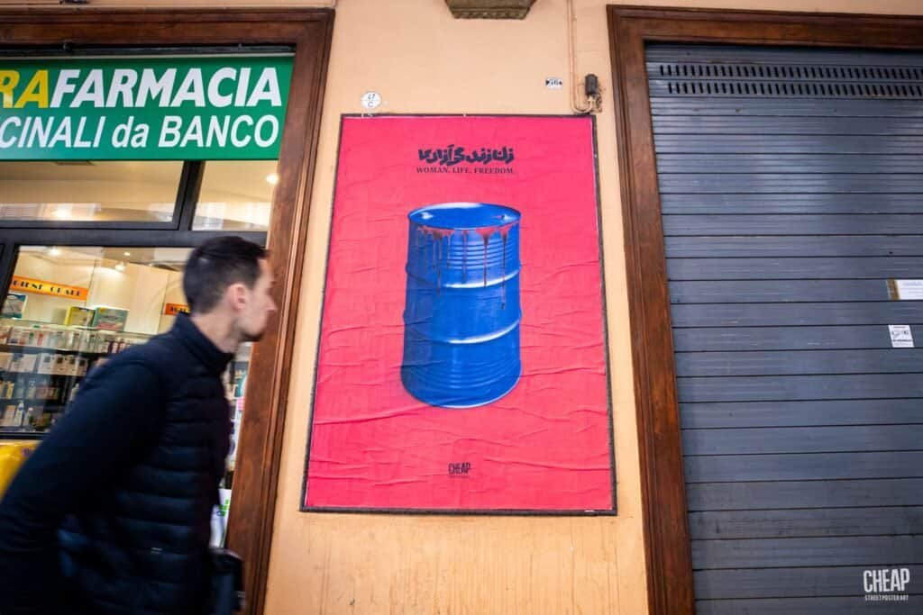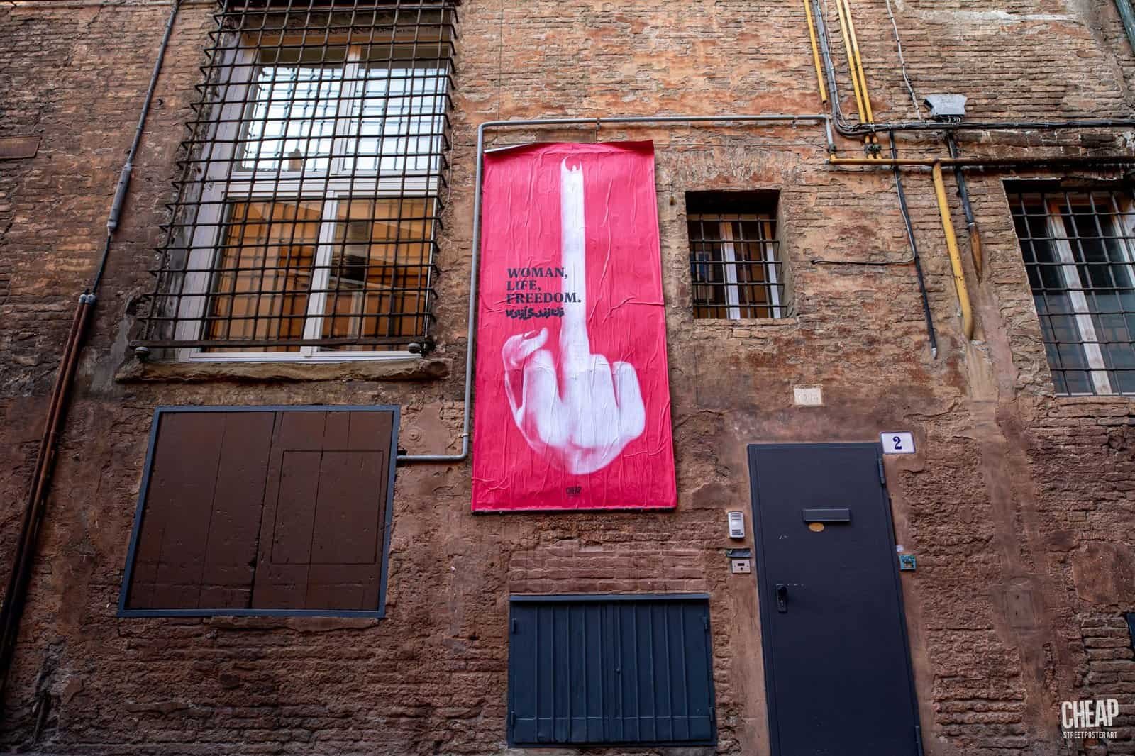 Nuova affissione di CHEAP in quel di Bologna, nientemeno che nei giorni di Arte Fiera e Art City 2023. E in tipico stile di CHEAP, i riflettori questa volta si sono accesi su labbra che esibiscono un lucido rossetto, su un braccio alzato e un pugno chiuso in un universale gesto di lotta, su un fusto di petrolio che gronda sangue, su un inequivocabile dito medio alto come un minareto; ossia su elementi fotografici che raccontano le lotte che da mesi stanno attraversando l’Iran al grido di “Donna, Vita, Libertà” e che vengono qui rivisitati da graphic designer iranianə e anonimə del collettivo AIA, in un lavoro realizzato in partnership con UNTOLDs, la webzine di Wesual, uno spazio web che, attraverso articoli e approfondimenti, contribuisce ad alimentare riflessioni sulla fotografia, sugli archivi e sui formati di diffusione delle immagini nella contemporaneità.