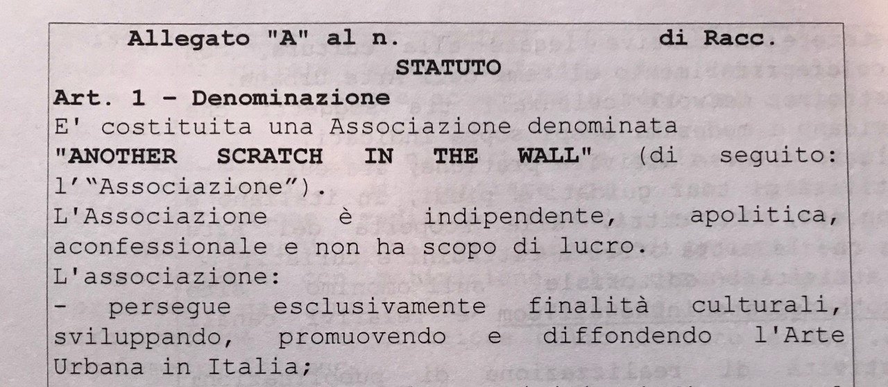 Oggi, Miriana, Lorenzo e io non siamo più solo amici e compagni di sventure, ma siamo anche i soci fondatori dell’associazione culturale Another Scratch In The Wall. Una mezza cazzata ai vostri occhi, ma un grande, soddisfacente passo per chi, come me, ha visto questa cosa nacere. Non solo da zero, ma anche a caso e completamente contro voglia. D’ora in avanti la strada è tutta in salita e nessuno può dirci se sarà un fallimento o un successo. Di sicuro, è una figata unica.