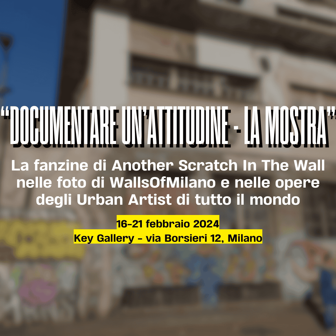 In 5 anni si possono fare tante cose. Another Scratch In The Wall, associazione culturale milanese nata sulla base dell’omonimo blog aperto nel 2014, ci ha messo esattamente questo lasso di tempo per mettere a punto, proporre e infine realizzare, nella città di Milano (e non solo), attività varie di divulgazione e comunicazione sul tema dell’Arte Urbana. E, alla fine del 2023, raccogliere tutti i suoi viaggi, i suoi progetti, i suoi successi e anche i suoi insuccessi in una fanzine, “Documentare un’attitudine”, dove le parole si alternano alle immagini. E proprio da qui muove l’esibizione “Documentare un’attitudine – la mostra”, una raccolta per immagini del primo, entusiasmante primo lustro di questa associazione culturale dal nome impronunciabile. Lo fa con l’aiuto di due amici imprescindibili e storici: WallsOfMilano, fotografo che in mostra espone le sue più iconiche foto scattate negli ultimi 15 anni di attività, e Key Gallery, alleata fondamentale che in mostra porta le opere di artisti di fama internazionale che la stessa associazione ha più volte avuto modo di raccontare al suo pubblico.