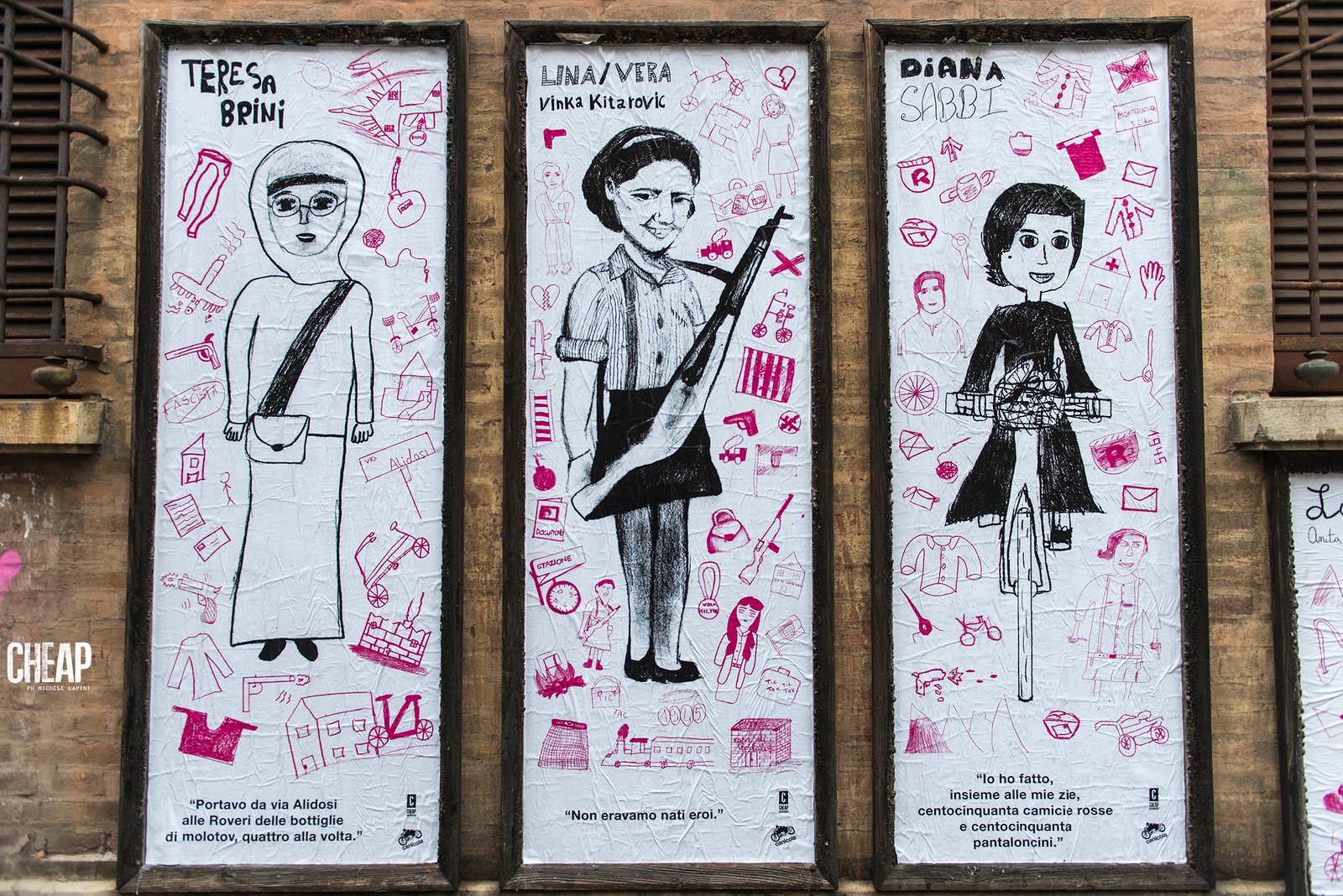 E poteva non c’entrarci CHEAP? Ospitati nel circuito CHEAP on Board, i poster (diciannove, in grande formato) sono il frutto di un progetto curato da Canicola che ha coinvolto anche nell’affissione i ragazzi di alcune classi delle due scuole medie in oggetto con il duplice obiettivo di valorizzazione di una pedagogia della memoria e di allontanamento da alcuni inospportabili stereotipi di genere radicati nella nostra cultura.