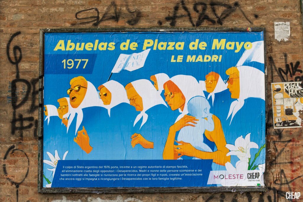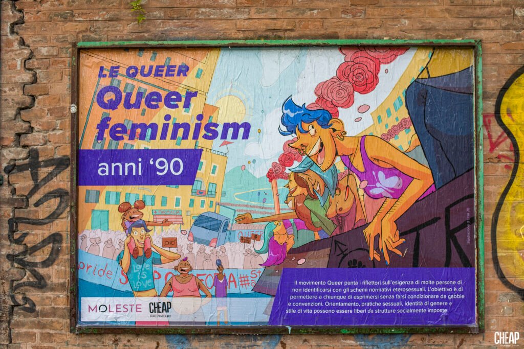 CHEAP torna alla riscossa per le strade bolognesi con un nuovo progetto di Public Art. Realizzata insieme a Moleste – collettivo di professioniste impegnate nella parità di genere nel fumetto – e affissa tra Via Irnerio e Via Mascaralla a Bologna, l’iniziativa “LE articolo autodeterminativo” è un percorso di undici manifesti. Tappe di un viaggio che ripercorre alcuni momenti significativi per la conquista dei diritti: dal divorzio (1970), all’aborto (1978) al riconoscimento dei legami same-sex (2016); dalle grida che hanno mosso movimenti culturali come la sex positivity esplosa negli anni Ottanta all’invasione queer nello spazio pubblico nei 90s; fino a raccontare figure iconiche che hanno rotto gli schemi del patriarcato rischiando (e talvolta perdendo) la loro vita: Ada Lovelace, Tamara de Lempicka, Franca Viola, Franca Rame ma anche Asociación Abuelas de Plaza de Mayo – LE Madri dei desaparecidos vittime della dittatura argentina negli anni Settanta e Ottanta – e LE Resistenti, omaggio alle donne combattenti per la liberazione dal nazi-fascismo in Italia.