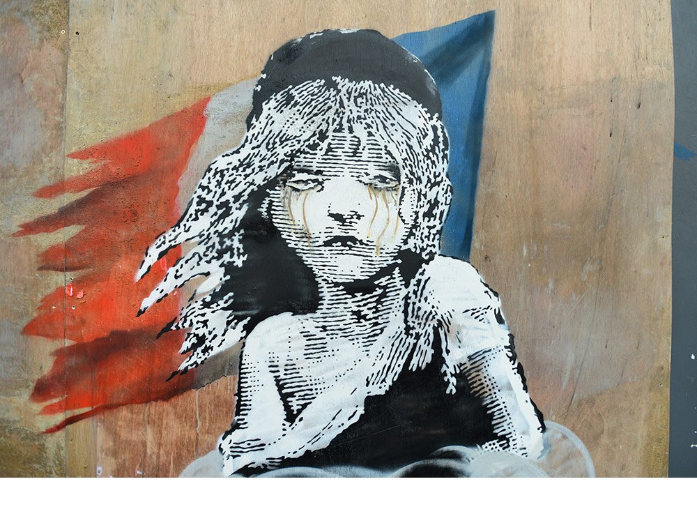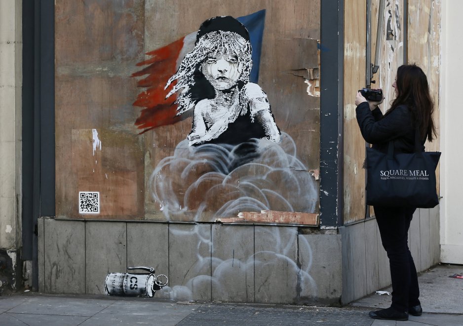 A essere rappresentato è il volto in lacrime della Cosette di Émile Bayard, il cui disegno – comparso nella seconda edizione del romanzo di Victor Hugo “Les Misérables”- divenne poi il simbolo del popolarissimo musical. La ragazzina vestita di stracci e ravvivata dal tricolore sfrangiato francese ha le lacrime agli occhi: a terra c’è una bomboletta dalla quale fuoriesce una nube di gas che simboleggia i lacrimogeni sparati dagli agenti francesi per respingere i migranti del Campo Giungla. L’opera è poi dotata di un codice QR: avvicinandovi il telefono chiunque può vedere on line il video, datato al 5 gennaio scorso, di un raid della polizia contro i profughi del campo. Un commento “alla Banksy” sui recenti tentativi delle autorità francesi di demolire una parte del campo di Calais, ora considerato “pericoloso” e di sfrattare circa 1.500 rifugiati.