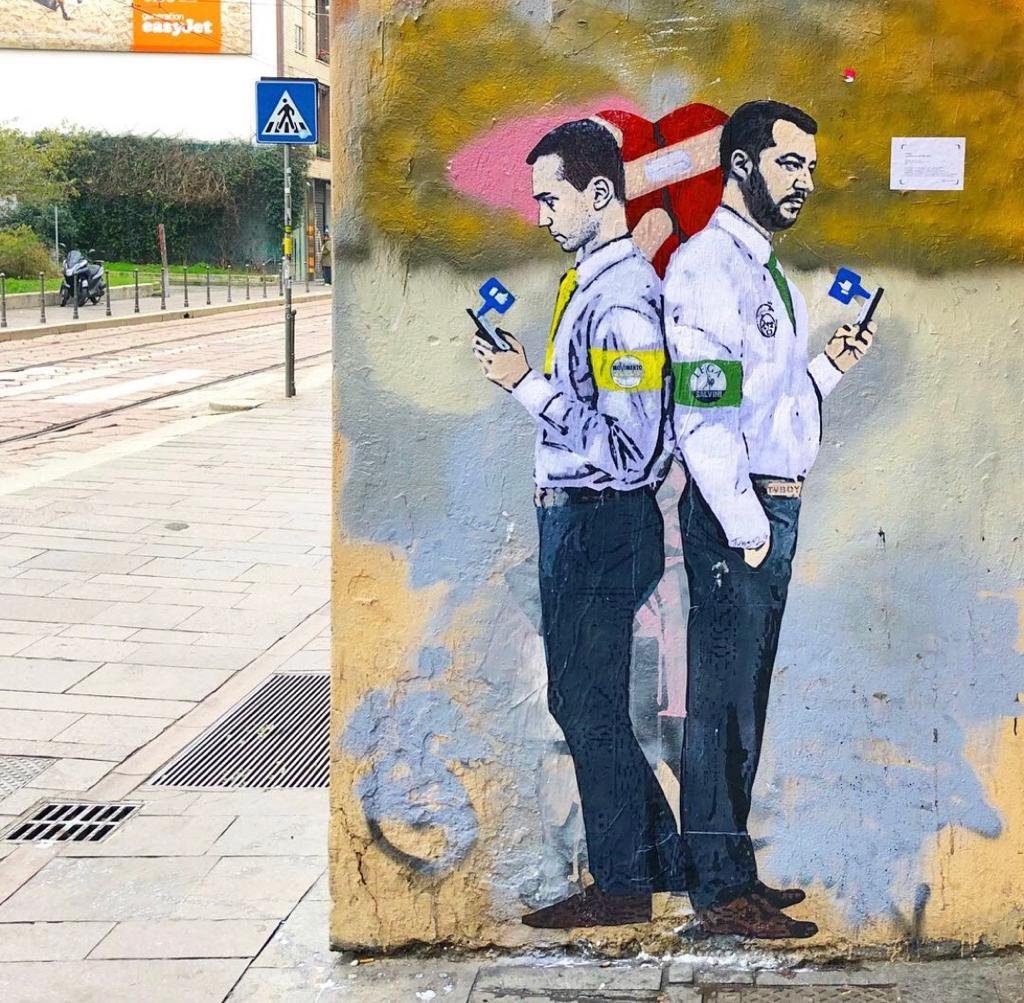 “Guerra dei Socials” è il paste up che, in corso di Porta Ticinese, raffigura Luigi Di Maio e Matteo Salvini che, spalle contro spalle, non si lascano andare a effusioni ma, al contrario, si fanno la guerra a suon di like e dirette Facebook. E a sancire la fine dell’idillio sullo sfondo c’è un cuore fatto a pezzi, tenuto insieme da dei cerotti.