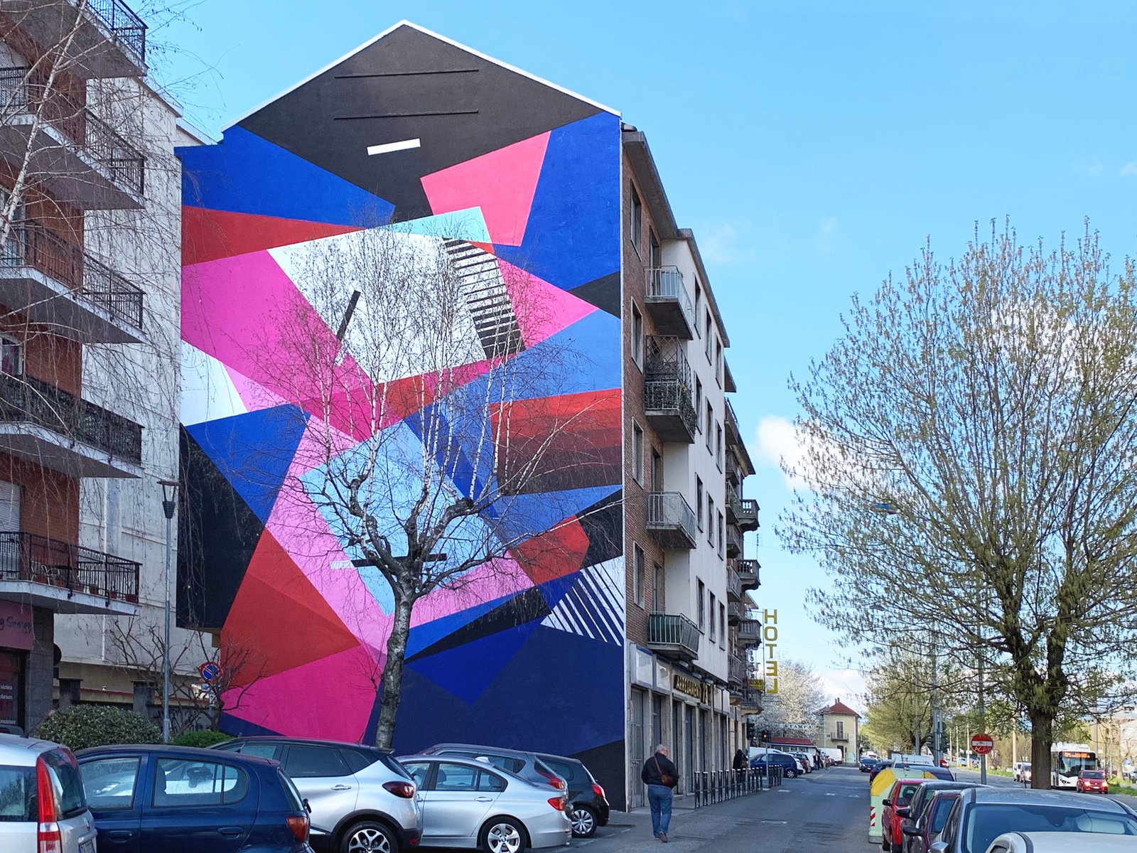 Il rapporto tra grafica e urbanistica, tema centrale della sua ricerca, ha infatti spinto l’artista a realizzare, questa volta, un dipinto murale che include elementi della vegetazione circostante: l’artista ha così ideato l’artwork valorizzando con cromie e forme gli alberi antistanti, creando una particolare illusione ottica che fa percepire la vegetazione come parte del dipinto stesso.
