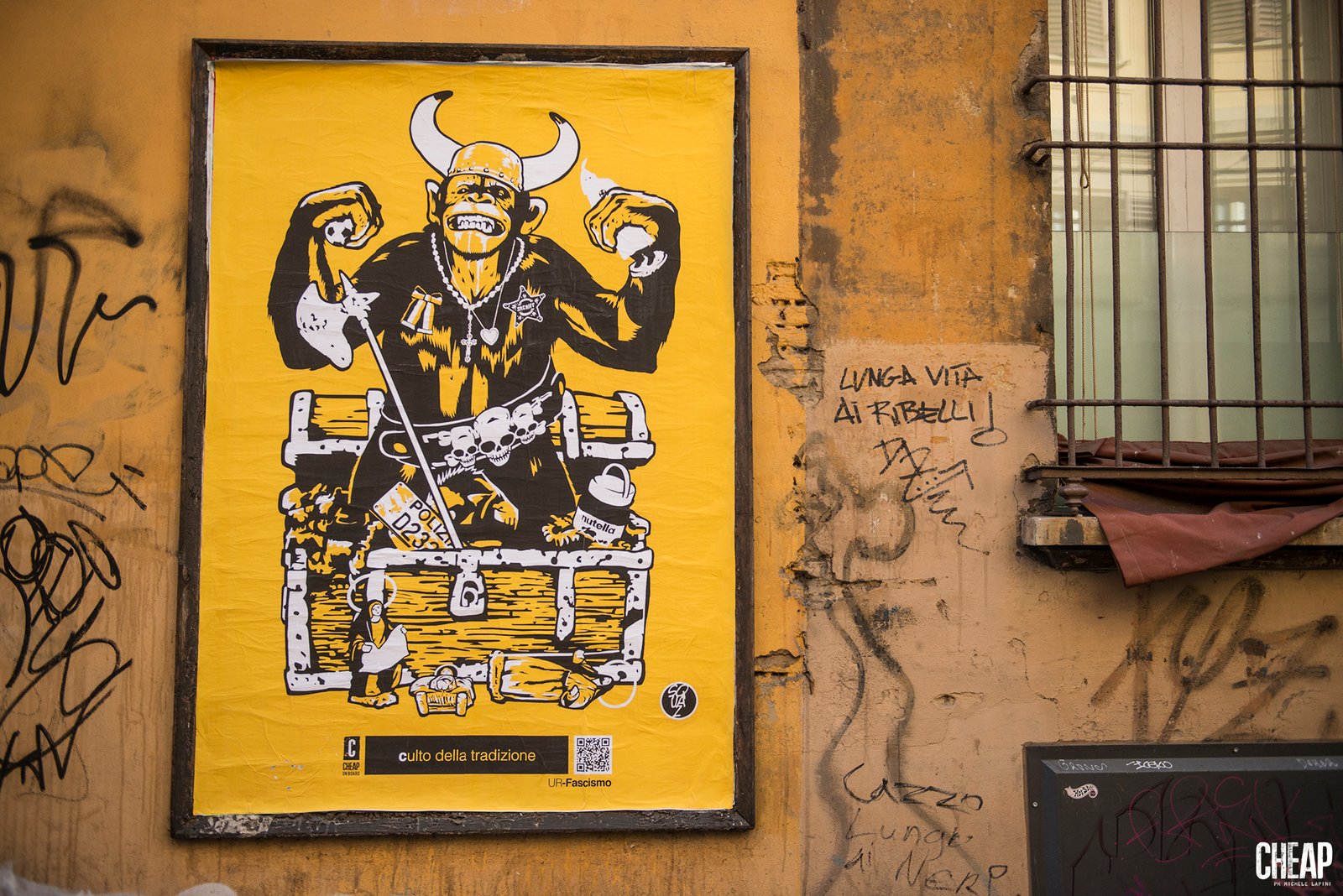 Ormai lo sapete: quando CHEAP ci si mette, sa sfornare idee tra le più belle sia dal punto di vista estetico sia, soprattutto, per il contenuto delle opere che veicolano impegno sociale, denuncia e attivismo di genere oltre che politico. Rientra appieno in questo ragionamento la sua nuova affissione, Ur-Fascismo, che prende spunto dall’omonima conferenza tenuta da Umberto Eco nel 1995 alla Columbia University: 14 tratti riccorenti tipici della (a)cultura fascista, 14 dimostrazioni che, nonostante cambino le condizioni storiche e materiali, il fascismo continua a manifestarsi con gli stessi caratteri. Il tutto spiegato nel prefisso “Ur”, che viene preso in prestito dal tedesco e che può essere tradotto in italiano con “antichissimo” od “originale”, per traslazione “perenne”: nella conferenza, infatti, Eco esplicitava un’idea di fascismo che è prima di qualsiasi cosa un fatto di cultura, “un modo di pensare e di sentire, una serie di abitudini culturali, una nebulosa di istinti oscuri e insondabili pulsioni”.