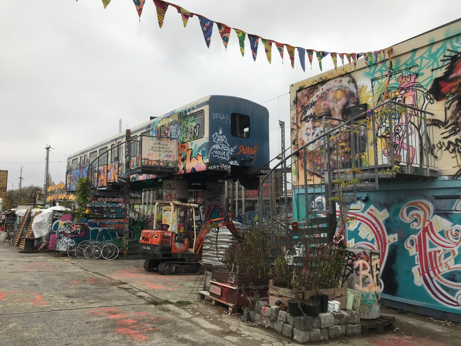 Il giro parte, dunque, dalla fermata della metro Poccistraße, da cui si raggiunge facilmente Tumblingerstraße. Questa è la via su cui affacciano i graffiti esterni del Bahnwärter Thiel: un’intera area commerciale appartenente a un ex mattatoio (ma sul quale affacciano alcune imprese ancora attive) dove, a partire dal 2015, sono stati riversati, a più riprese, decine di container per il trasporto marittimo originari del porto di Amburgo, un ex padiglione espositivo della Lenbachhaus e diversi vagoni della metropolitana di Monaco. L’obiettivo è stato, fin da subito, quello di dedicare un’intera area di città alla vita underground di clubbing, concerti, ma anche letture, mostre, improvvisazione teatrali, mercati delle pulci, giardinaggio urbano e, ovviamente, graffiti. Il tutto nel nome della novella ottocentesca “Bahnwärter Thiel” (Il casellante Thiel), con i suoi protagonisti Thiel e Minna.