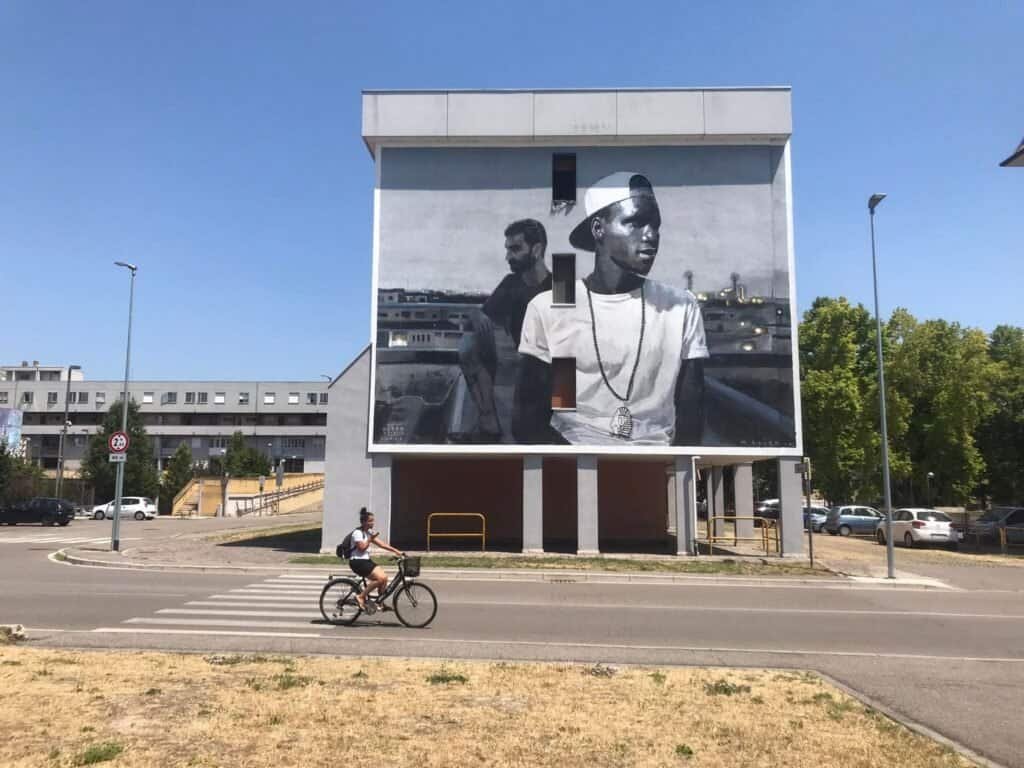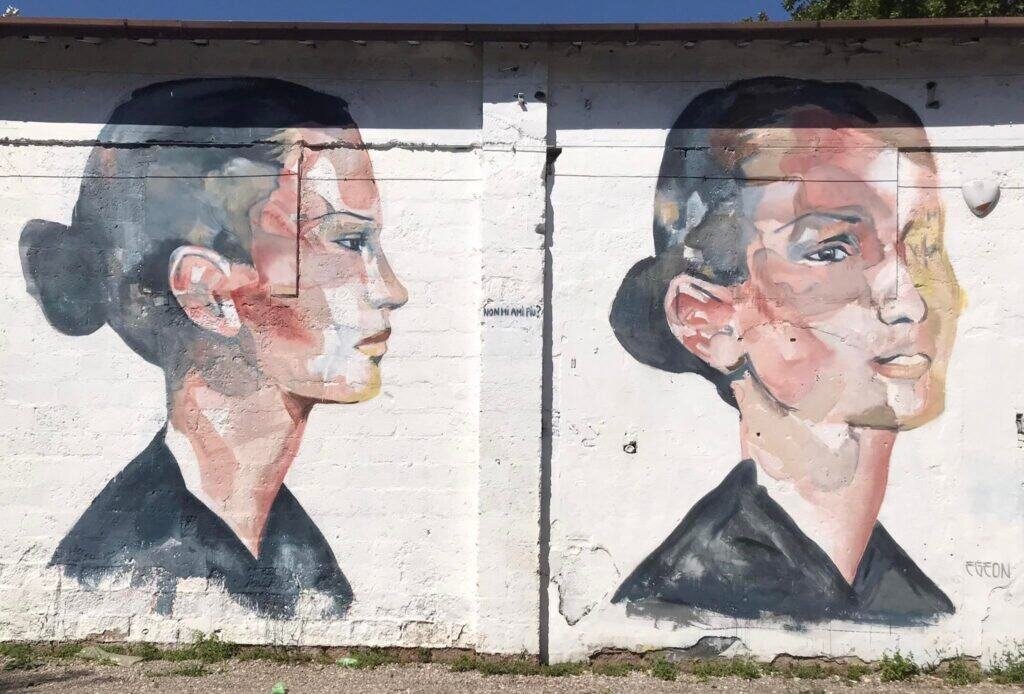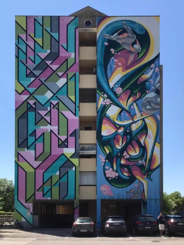 Chiusa l’esperienza padovana, l’indomani è stata la volta di Mantova: qui niente (o non più solo) Palazzo Te, Palazzo Ducale e chiesa di San Giorgio, ma un altro, esplosivo progetto di Arte Urbana con curatela di valore e nomi di grandissimo spessore, che hanno donato a un quartiere storicamente periferico, lontano, distante, diviso e divisivo e poco conosciuto di Mantova una veste nuova, culturalmente e stilisticamente all’altezza del patrimonio artistico che, invece, contraddistingue il centro storico della città. Parlo, ovviamente, di WITHOUT FRONTIERS, Lunetta a Colori, Festival di Arte Urbana nato nel 2016 per Mantova Capitale Italiana della Cultura: organizzato da Caravan Setup e curato dalla “testa fina” di Simona Gavioli (una professionista, oltre che un’amica), nel tempo la kermesse ha portato a Mantova i nomi più forti e interessanti della scena dell’Arte Urbana, permettendo al quartiere non solo di cambiare pelle ma anche di riflettere sui vari temi di anno in anno trattati. Quello di quest’anno, per esempio, è stato il “Per-Durare”, topic di grande attualità dopo gli stravolgimenti pandemici degli ultimi due anni: a lavorarci sono stati Corn79, Vesod, Luca Zamoc, Sara De Lucia e Elisa Veronelli, partecipando, così, ai festeggiamenti per il settimo compleanno di Without Frontiers | Lunetta a Colori.