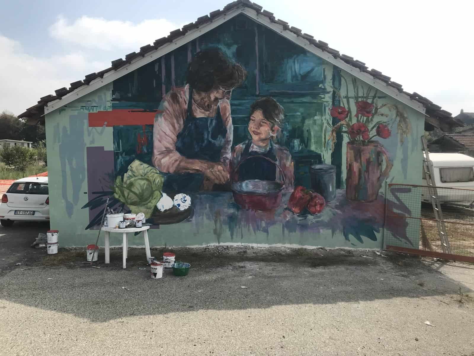 “T’ musta tò nona” è il titolo dell’opera di Trisha, che ha omaggiato il patrimonio culinario del territorio rivese e piemontese in una scena, resa nell’elegante stile pittorico dell’artista, che rappresenta un momento intimo di trasmissione orale e manuale, tanto da restituire il calore di una fotografia analogica. Il murale, evocativo di una condivisione familiare, è caratterizzato da molti elementi significativi: il paiolo, la spiga di riso e i papaveri rossi. Il titolo vuole dire: “ti insegna tua nonna”.